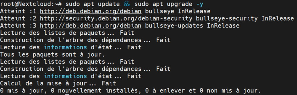 Pour débuter l’installation de Nextcloud sur Debian 11, nous allons mettre à jour notre machine Debian :