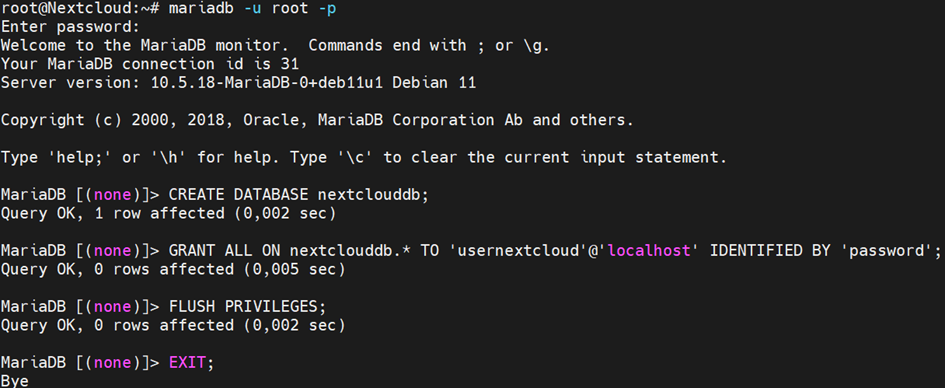 GRANT ALL ON nextclouddb.* TO 'usernextcloud'@'localhost' IDENTIFIED BY 'password';