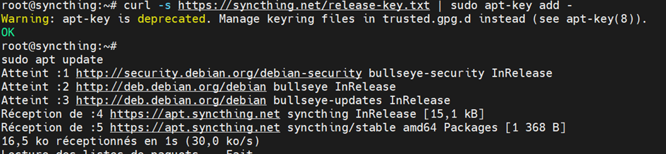 Ensuite, nous allons ajouter la clé PGP du dépôt Syncthing à nos clés apt en utilisant la commande suivante :