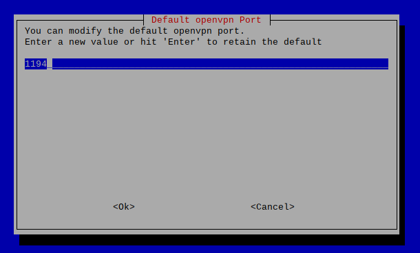Vous devrez ensuite sélectionner le port que votre serveur OpenVPN utilisera. Par défaut, le port 1194 est suggéré, mais vous êtes libre d’en choisir un autre en fonction de vos besoins. Assurez vous toutefois d’ouvrir ce port dans les règles NAT/PAT de votre routeur pour permettre le bon fonctionnement du serveur.