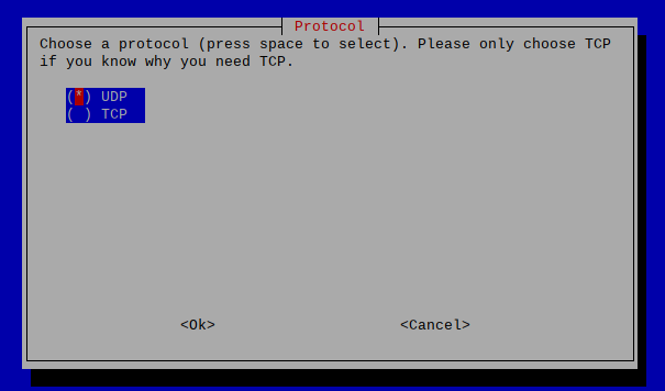 PiVPN vous offre ensuite la possibilité de choisir entre les protocoles UDP et TCP. Une configuration en UDP est généralement plus rapide, car les paquets sont envoyés sans nécessiter de confirmation de réception. En revanche, avec le protocole TCP, chaque paquet est confirmé à l’arrivée, ce qui permet une vérification de leur intégrité, mais au prix d’une vitesse légèrement réduite.