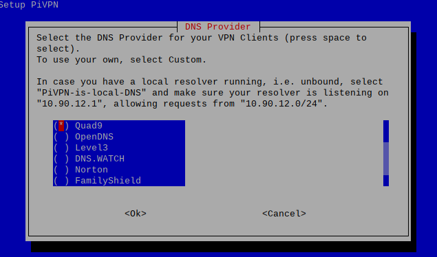 Nous sommes presque à la fin ! Il reste à spécifier le port à utiliser et à rediriger vers votre Raspberry Pi. Pour WireGuard, le port par défaut est le 51820 (UDP). Sur l'avant-dernier écran, il vous sera demandé de choisir un fournisseur de DNS pour les clients. Si vous utilisez AdGuard ou PiHole dans votre réseau pour bloquer les publicités, c'est l'occasion de sélectionner l'option "Custom" (tout en bas de la liste) et d'y entrer le nom ou l'adresse IP de votre service. Vous pouvez en ajouter deux, séparés par une virgule.