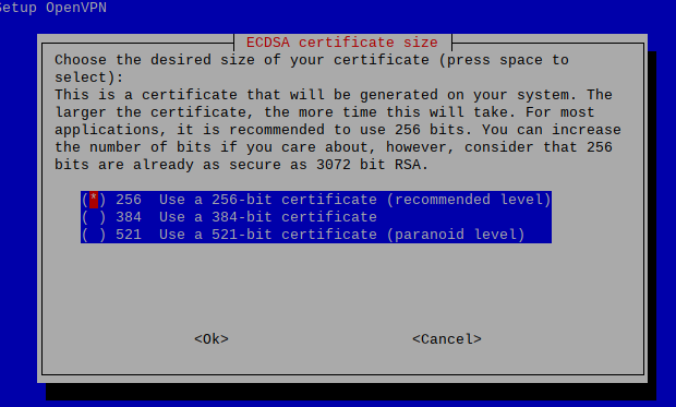 Vous aurez le choix entre trois niveaux de chiffrement. Sélectionnez celui qui correspond le mieux à vos besoins. Un chiffrement de 4096 bits peut significativement ralentir la connexion. Pour notre part, nous avons opté pour l’option recommandée, le chiffrement de 2048 bits.