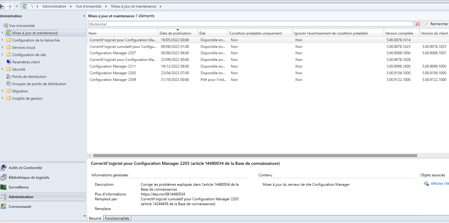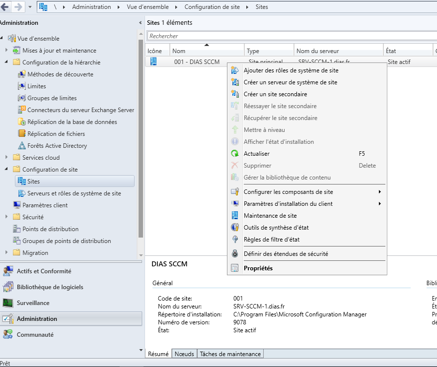 Vérifier que la version SCCM a bien été mise à jour en allant dans Administration > Configuration du site > Sites.