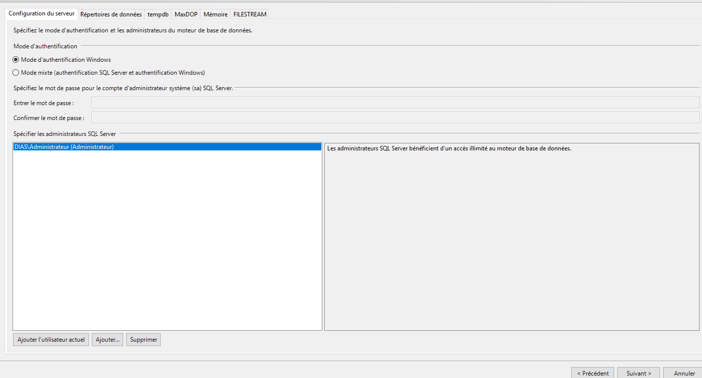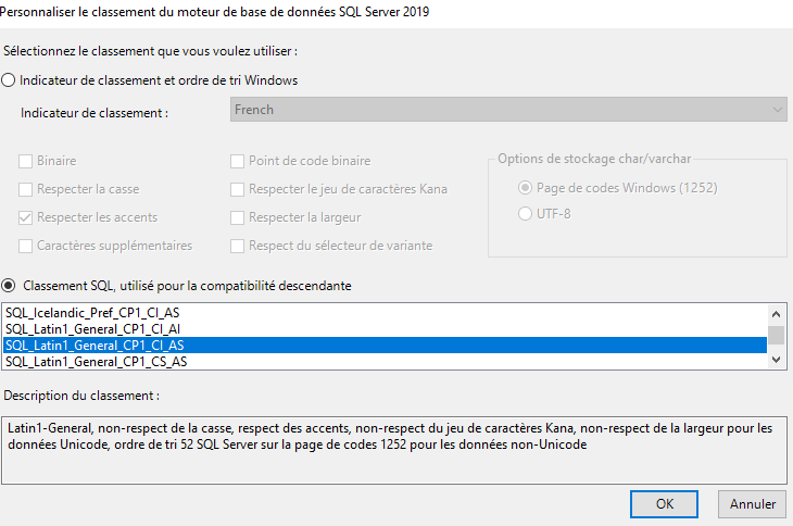 Classement>Personnaliser>Classement SQL>SQL_Latin1_General_CP1_CI_AS>ok>suivant